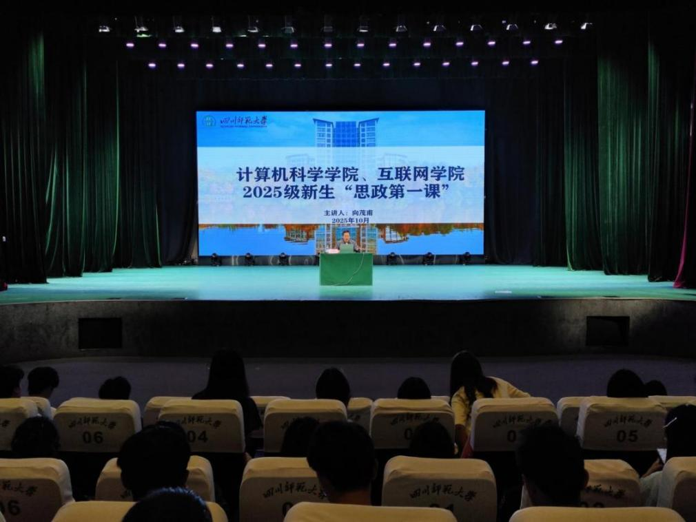 10月16日中午13:00,计算机科学学院与互联网学院在成龙校区龙湖剧场联合举行新生“思政第一课”。本次思政课由学院党委书记向茂甫主讲,主题为“青春筑梦 不负韶华——如何做好自己的学业规划”。计算机科学学院与互联网学院新生辅导员、2025级全体新生参加学习。讲座由计算机科学学院辅导员徐寄尘主持。