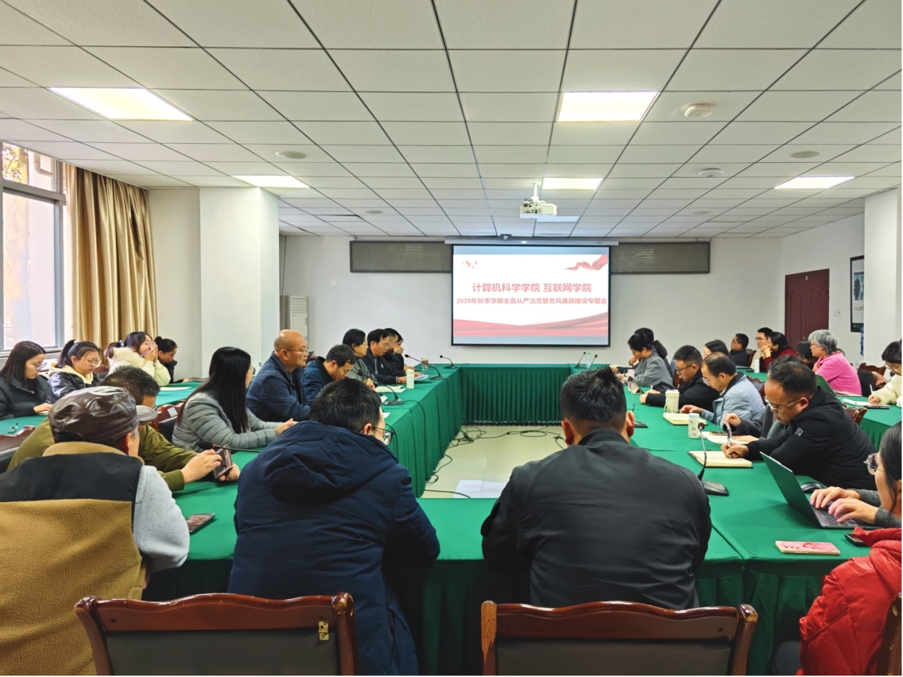 11月27日下午,计算机科学学院、互联网学院在成龙校区办公楼124会议室召开2025年秋季学期全面从严治党暨党风廉政建设专题会议。学院党政班子成员、党委委员、纪委委员、各党支部书记及支委委员、各科室负责人、全体行政人员、实验室工作人员和辅导员参加会议。会议由学院党委副书记、院长李晓宁主持。